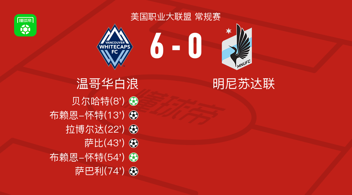 温哥华白浪6-0血洗明尼苏达联取美职联4连胜,布赖恩-怀特梅开二度,萨巴利破门